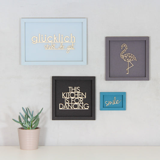 GLÜCKLICH STEHT DIR GUT - Holzschrift in hochwertigen Kartonrahmen 21x15cm